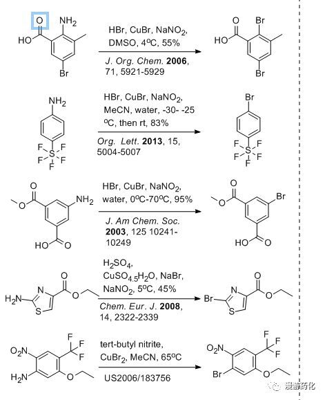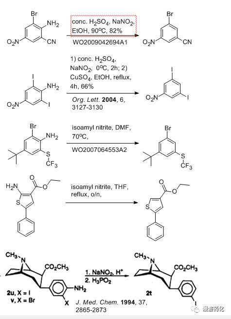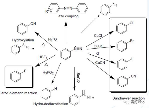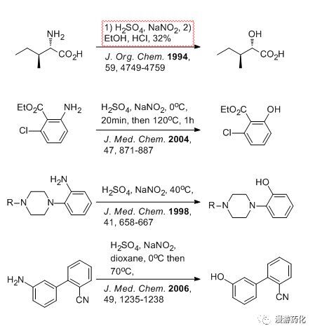 另外,該反應與變成羥基的試劑咋看很類似,區別就是前者是在硫酸的水溶液加熱發生羥基取代,后者是在濃硫酸的環境中脫除反應,或是有硫酸銅或銅粉的催化,或是在亞磷酸的還原氣氛中脫除。