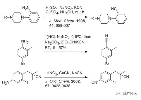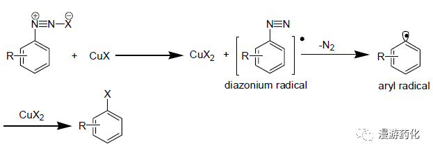 對于重氮鹽生成鹵代芳烴和腈基化合物的反應,其機理還沒有完全搞清楚,一般我們認為是一個自由基反應,苯環上的取代基(如羥基,烷氧基,?;然?,硝基和鹵素等),無論是吸電子基團還是供電子基團,對反應都沒有特別的影響,氯代必須用CuCl/HCl 體系,溴代則要用CuBr/HBr 體系,碘代則一般用鹽酸做重氮鹽,不用Cu 鹽催化,直接加KI或NaI 就能得到碘苯。
