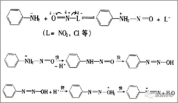 芳胺的重氮化反應需經2步,首先是親電試劑進攻芳胺氮原子生成不穩定的中間產物,然后不穩定中間產物迅速分解,整個反應受第一步控制。無機酸不同,參與重氮化反應的親電試劑也不同。稀硫酸中參與反應的是N2O3(一為不穩定結構ONONO,一為穩定結構ONNO2),鹽酸中參與反應的是亞硝酰氯NOCl;在濃硫酸中則是亞硝基正離子N+O。他們的親電性強弱順序為: N+O>NOCl>N2O3