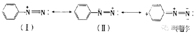 共振式(I)(II)可解釋重氮鹽有雙重反應性能, (I)式表現易發生放氮的取代反應,(II)式作為重氮組分進行偶合反應。