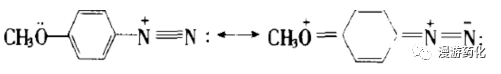 重氮鹽的氮原子為sp雜化,當重氮離子與芳烴相連,芳環的大π鍵與重氮基的π鍵共軛,使得其穩定性較脂肪族重氮鹽的高。由于共軛效應影響,單位正電荷并不完全集中在一個氮原子上,共振式如下:
