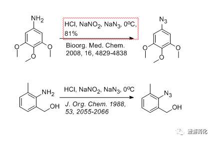 由于疊氮鈉是劇毒品,碰擊易炸,使用要小心。切忌敞口環境下與酸混合,否則生成劇毒的疊氮酸氣體。做此類反應,需要在密閉的體系中操作,其中一口用反扣的橡皮塞,最后把疊氮鈉溶于水中,用注射器推入到反應體系中。反應跟蹤時,用注射器取樣,產物大多在LCMS上不出分子離子峰。TLC板跟蹤。
