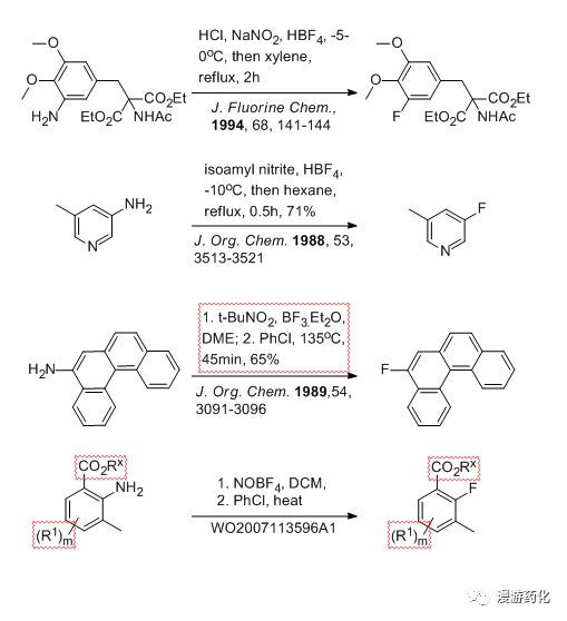 1927 年,同樣是德國的化學家G.Balz和G.Schiemann發現直接加熱苯胺的硼氟酸重氮鹽能得到氟苯,這就是Balz-Schiemann反應。